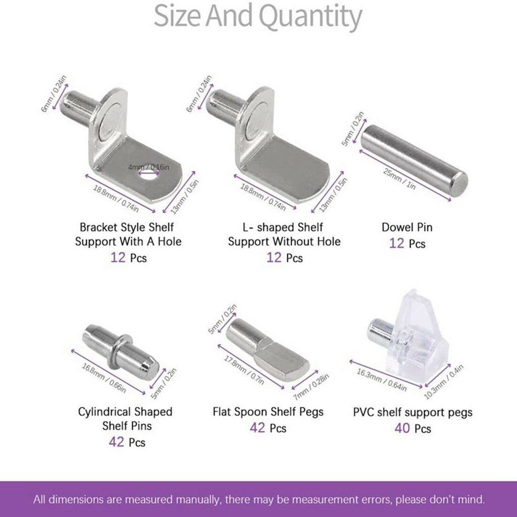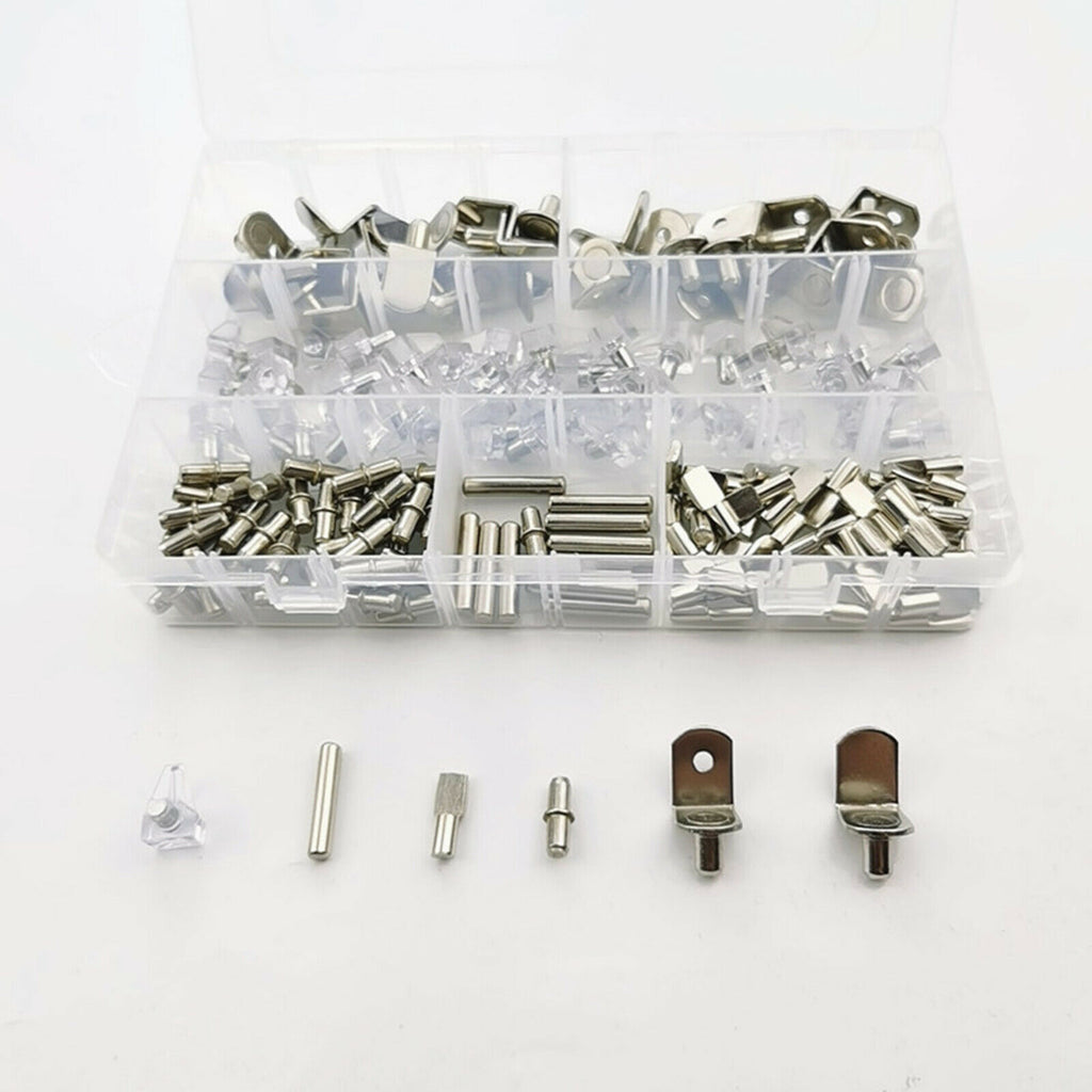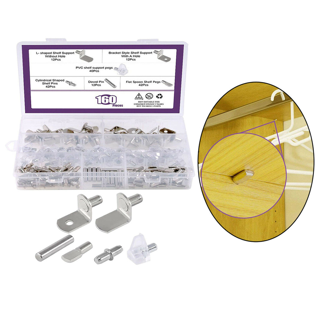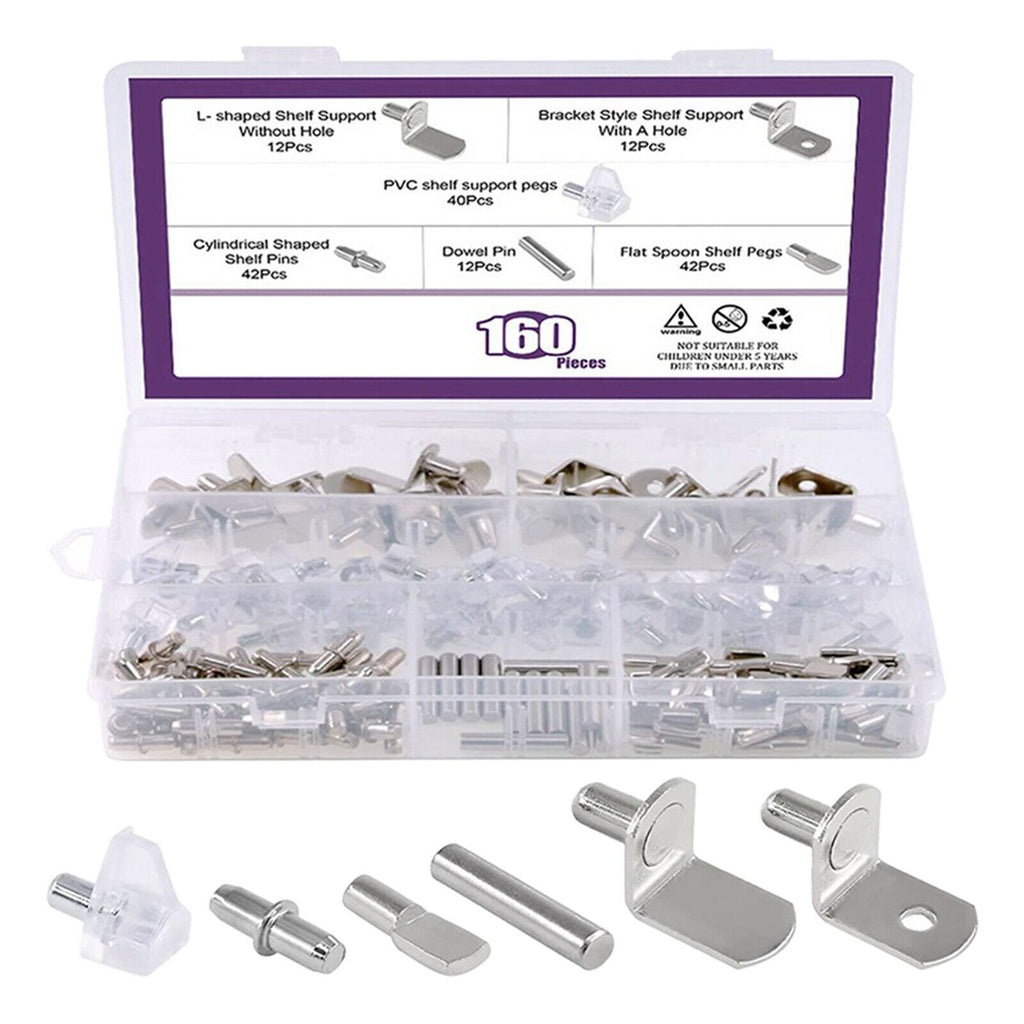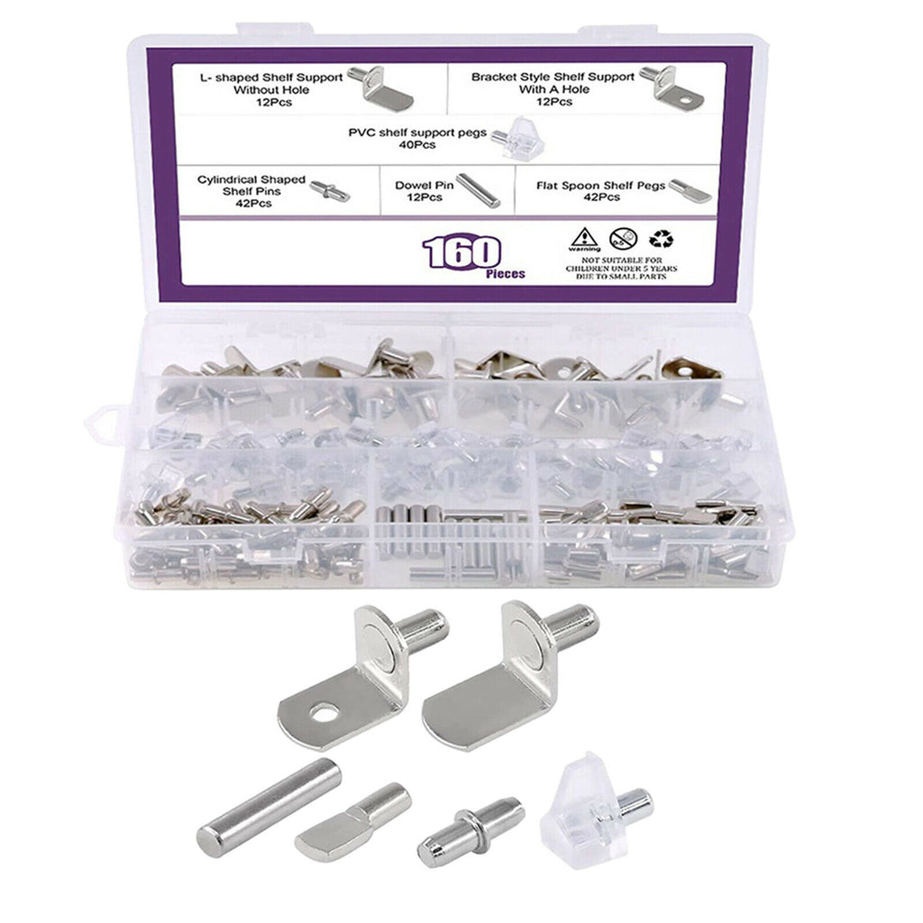 ITEM NAME:160Pcs 6 Styles Shelf Pins Assortment Bracket Book Shelves Pins Support Description: Carbon steel, good quality and durable for long using life. 6 styles shelf support pins for you in one package. Bracket style shelf support size: 6 mm/ 0.24 inch in diameter, 13 mm/ 0.51 inch in width. Spool shelf support size: 5 mm/0.20 inch in diameter; Cylindrical shaped shelf pins size: 5 mm in diameter, overall length is 16 mm/ 0.59 inch; Dowel pins sizes: 5 mm in diameter; 25 mm in Length. PVC shelf pins: Diameter: 5 mm / 0.20inch, length: 8 mm/ 0.31 inch. In order to make dowel pins a tight fit, your hole should be equal to or slightly smaller than the diameter shown. These shelf support pins can fit 5 mm and 6 mm shelf holes on cabinets. Come with a plastic box for storage, These can use for shelf holes on cabinets, bookcases, and more. They are perfect shape, size and all chrome. In this kit, You will get 12pcs × L Shaped shelf support without hole; 12pcs × Bracket style shelf support with hole; 12pcs × Dowel Pins; 40pcs × PVC shelf support pins; 42pcs × Cylindrical Shaped Shelf Pins; 42pcs × Flat spoon shelf pegs. In toatl 160Pcs in a plastic box. Specification: Material: Carbon steel Package Includes: 160 Pieces Shelf Pins.Find many great new & used options and get the best deals for 160Pcs 6 Styles Shelf Pins Assortment Bracket Book Shelves Pins Support at the best online prices at Order2india Shopping! Free shipping for many products!