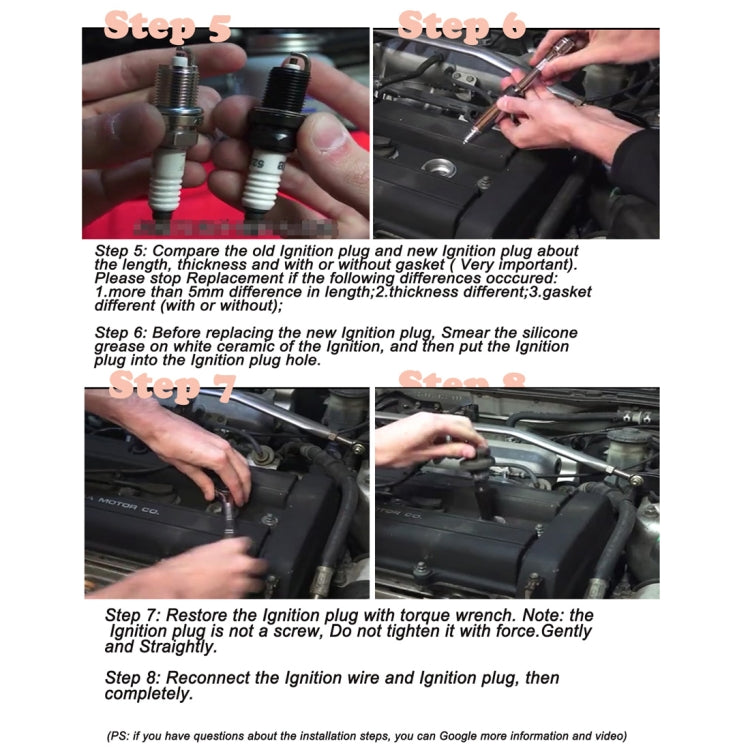 Step 5: Compare the old Ignition plug and new Ignition plug about the length, thickness and with or without gasket ( Very important). Please stop Replacement if the following differences occcured: 1. more than 5mm difference in length; 2. thickness different; 3. gasket different (with or without);