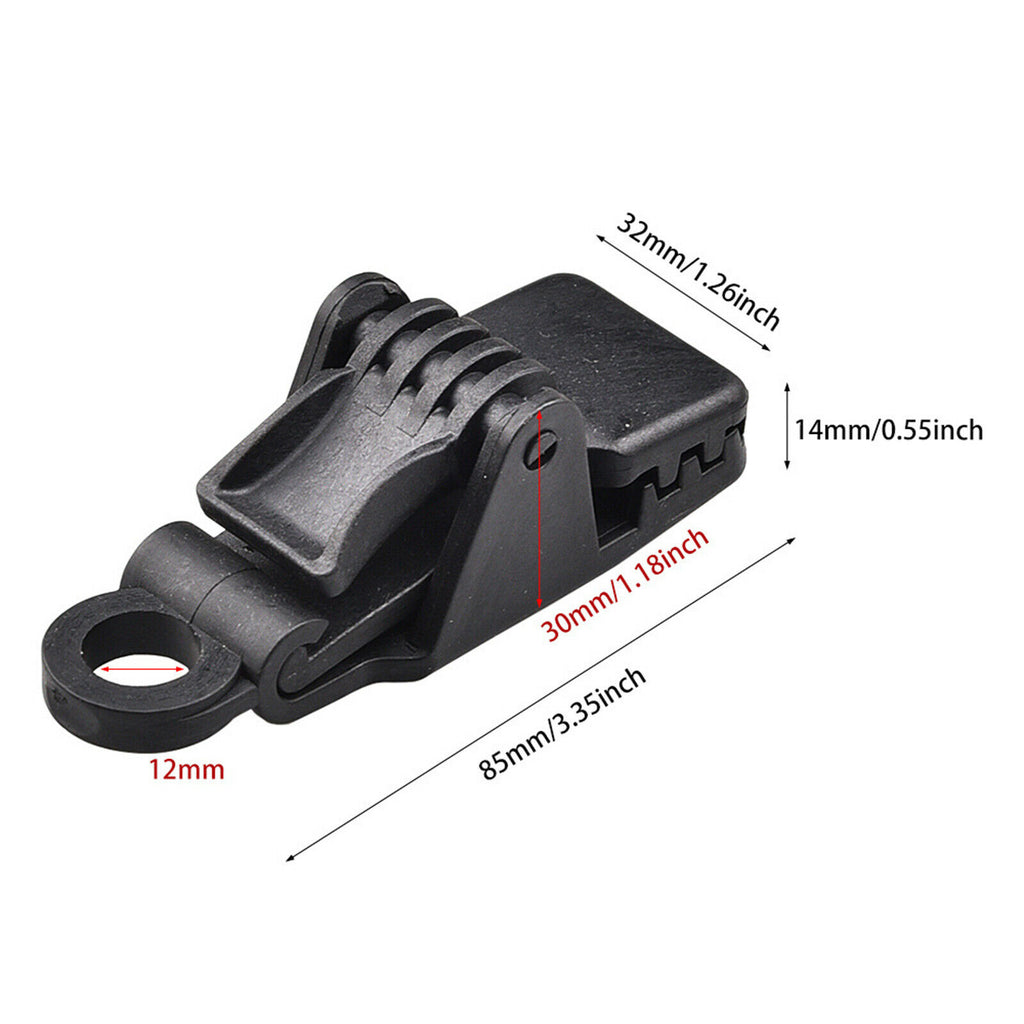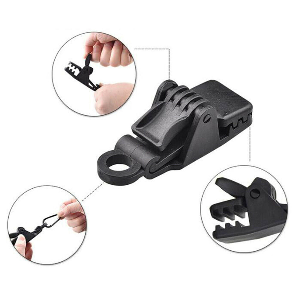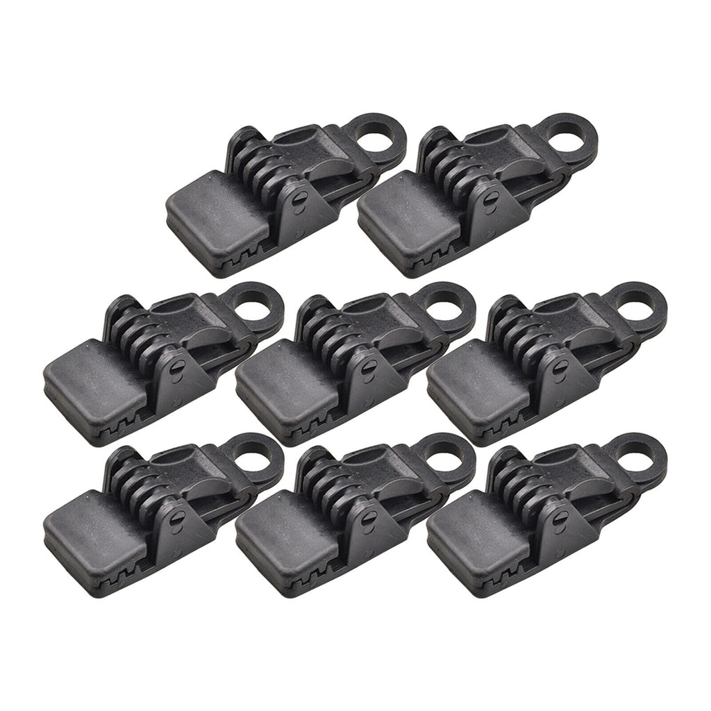 ITEM NAME:8Pcs Reusable Tarp Clips Awning Canopy Clamp Tent Snaps Camping Car Cover Description: Durable Material – Tarp clip made of high-quality nylon plastic, which is durable and not easy to break. It can be used for a long time. Size - 3.3 inches long, and 1.3 inches wide. It fits well with heavy-duty gray tarpaulins and has a hole to fit for rubber bands or carabiner . Design - Specially toothed alligator mouth design makes the teeth more stable fit fasteners. Easy to Use - Press-lock design makes it easy to tighten and loosen on tarps, the teeth inside hold the tarp tightly, but do not tear or damage it. Widely Use - Great for outdoor camping tent, awning, caravan, tarps, canvas, awnings, boat covers swimming pool covers, temporary shelters, or any fabric cover needing extra hold down points, etc. Specification: Material: Plastic Color: Black Size: 32x85mm/1.3x3.3inch Package Includes: 8 Pieces Tarp Clips.Find many great new & used options and get the best deals for 8Pcs Reusable Tarp Clips Awning Canopy Clamp Tent Snaps Camping Car Cover at the best online prices at Order2india Shopping! Free shipping for many products!