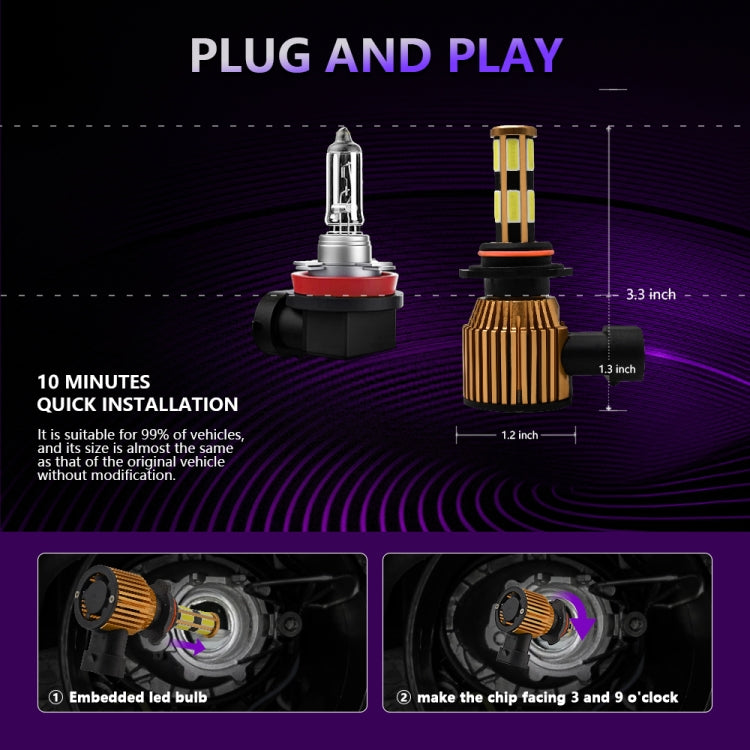 1. The head is designed with a 360-degree LED chip structure and has 12 high-performance LEDs. The light source has no ghosting, negative or dead corners, and the illumination range is wider and farther, making night driving safer. 2. Equipped with an efficient cooling system, an all-aluminum alloy lamp body, a hollow forged radiator design, and a 12000RPM high-efficiency silent cooling fan to ensure more efficient and stable operation of the lamp, and prolong the service life by 200%. 3. Plug and play, almost 1:1 design with the original car, with built-in drive structure and ultra-thin and ultra-short radiator, it is very suitable for 99% of car shells and original sockets. No need to change the dust cover of the original car, Installation is more convenient and beautiful. 4. It has anti-corrosion, dust-proof, waterproof and shock-proof performance to ensure your driving safety.