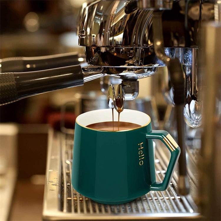 2. Elegant and luxurious design: the cup body is dark green, the glaze is clear and the color is exquisite.The rim of the cup and the pattern of HELLO are painted in gold, with a gold spoon, highlighting the elegant and luxurious temperament.