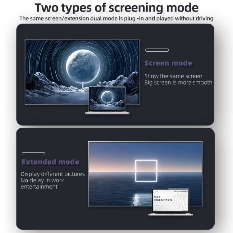 7. Support two projection modes, same screen/extended dual mode plug and play, no driver required