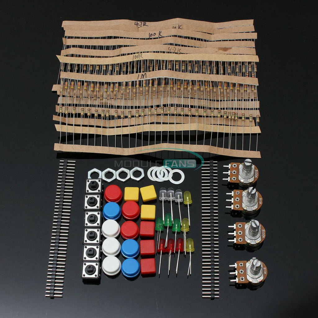 ITEM NAME:Electronic Parts Pack KIT for ARDUINO Component Switch Button Resistors MF Product Overview Electronic Parts Pack KIT for ARDUINO Component Switch Button Resistors MF Description Electronic Parts Pack KIT for ARDUINO Component Resistors Switch Button Package Include: 30 X 100Ω Resistors 30 X 1 kΩ Resistors 30 X 4.7 kΩ Resistors 30 X 10 kΩ Resistors 30 X 47 kΩ Resistors 30 X 100 kΩ Resistors 30 X 1 MΩ Resistors 2 X 3pin 15mm B10k Rotary Potentiometer 2 X 3pin 15mm B100k Rotary Potentiometer 3 X Red 5mm LED 3 X Yellow 5mm LED 3 X Green 5mm LED 3 X White 5mm LED 3 x 4pin 12x12mm Tactile Switch 9 x 12x12mm Round Tactile Button Cap (mixed color) 6 x 12x12mm Square Tactile Button Cap (mixed color) 2 x 40pin 2.54mm single pin male.Find many great new & used options and get the best deals for Electronic Parts Pack KIT for ARDUINO Component Switch Button Resistors MF at the best online prices at Order2india Shopping! Free shipping for many products!