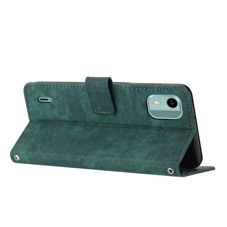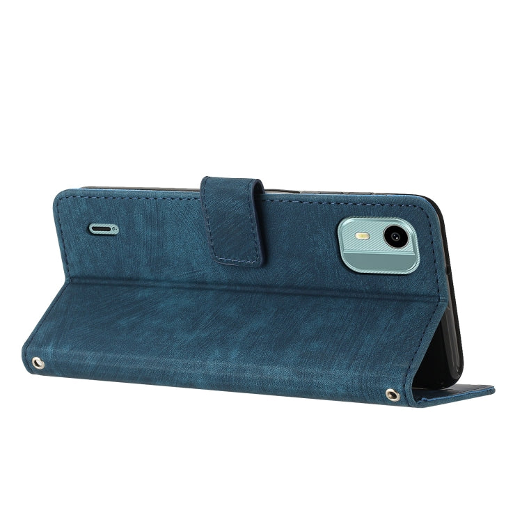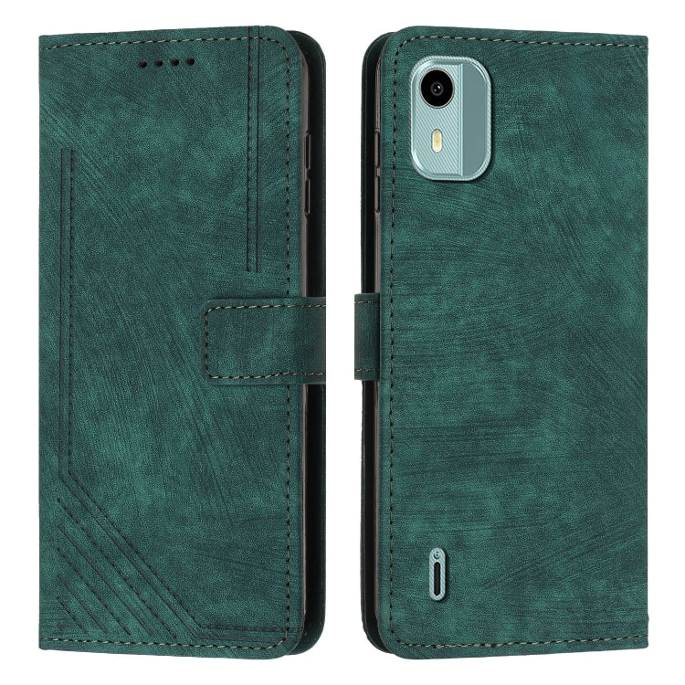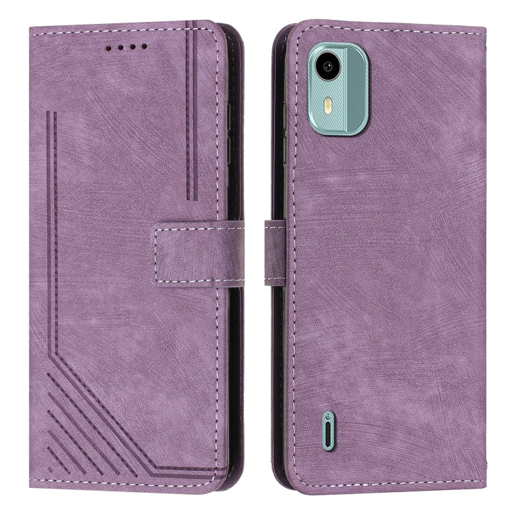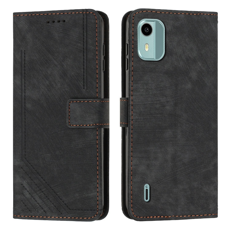 For Nokia C12 Skin Feel Stripe Pattern Leather Phone Case with Lanyard