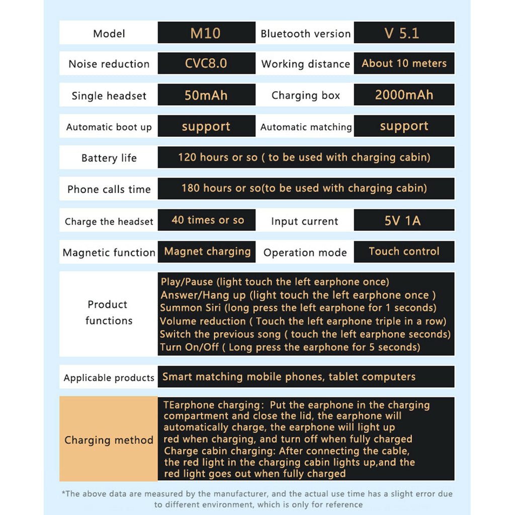 ITEM NAME:M10 Wireless Earbuds Bluetooth 5.0 Headphones Headphones Sport Small Screen Description: The latest Bluetooth 5.0, compatible with most bluetooth-enabled devices, Lower energy consumption, more stable signal Very strong bass, HiFi high fidelity sound quality, Dynamic unit design, good audio analysis, undistorted details, excellent listening experience 2000mAh charging case, Earbuds: 50mAh, Call time: 4-5 h hours, Charging time: about 1h Magnetic induction storage cabin, no need to press hard, the user experience has been greatly increased, and the embarrassment of opening the traditional button storage compartment has been solved Ergonomic designed, in line with the depth of the ear to listen for along time without pain IPX7 Waterproof and Sweat-proof, can listen to songs during exercise Can also be worn when taking a bath. Specification: Model:M10 Bluetooth specification:V5.0 Bluetooth Profile:A2DP,AVRCP, HFP;HSP Working voltage:3.1V~4.2V Charging voltage:5V-1A Battery capacity of the headset: 50MAH Battery capacity of the storage box:2000MAH Transmission distance:>10M Call time:4-5h Play time:4-5h Waterprof :IPX7 Charging time of headset:c Charging time of the Charging box:2h Support system: Most Bluetooth devices and mobile phones; Package Includes: 1xCharging Case 2x Wireless Bluetooth Earbuds 6x Ears Caps 1x Charging Cable 1x Manual Note: 1.Please allow 1~3 cm error due to manual measurement, thanks. 2.Due to the difference between different monitors, the picture may not reflect the actual color of the item. Please understand, thank you!.Find many great new & used options and get the best deals for M10 Wireless Earbuds Bluetooth 5.0 Headphones Headphones Sport Small Screen at the best online prices at Order2india Shopping! Free shipping for many products!