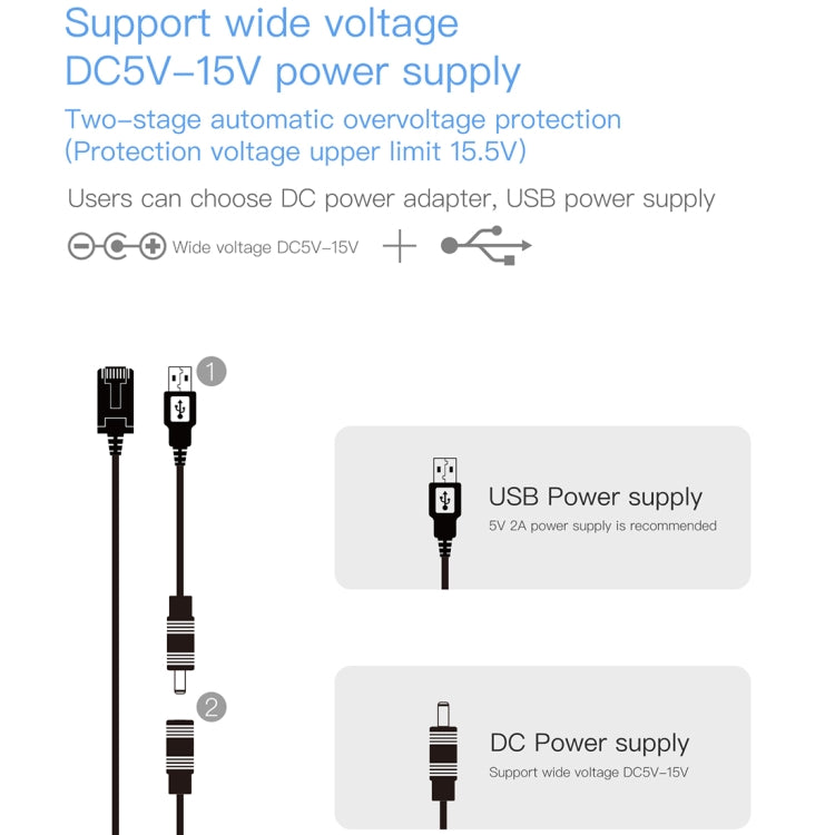 1. Support wide voltage DC5-15V power supply, two-stage automatic overvoltage protection (protection voltage upper limit 15.5V).