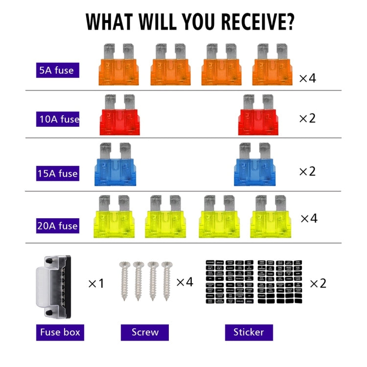 15. Product accessories: sticker X2; self-tapping screw X4; 20A insurance sheet X4; 15A insurance sheet X2; 10A insurance sheet X2; 5A insurance sheet X4